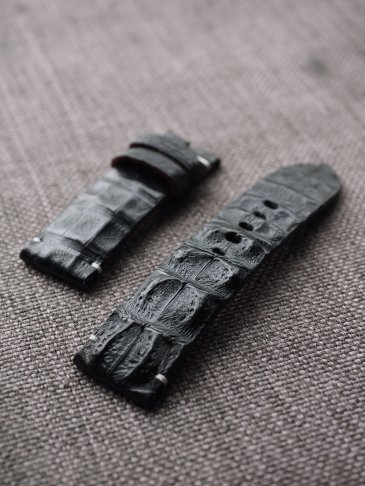 選材於歐洲奢侈品牌愛用染廠。凱門鱷魚不同於短吻鱷,風格粗曠,深受沛納海等大錶徑錶迷喜愛。
