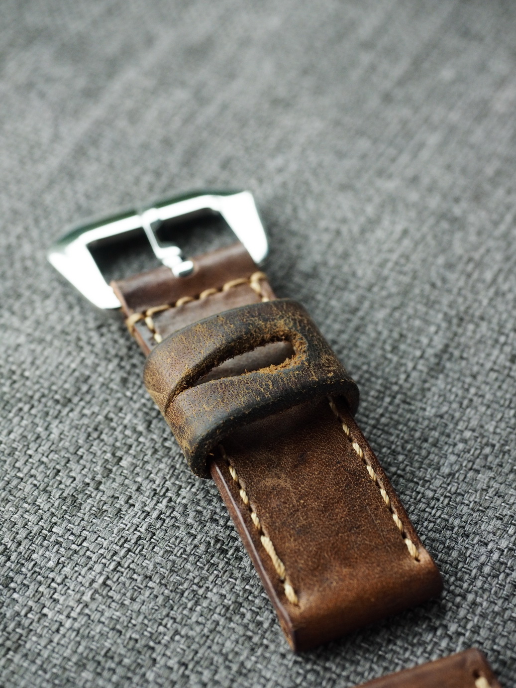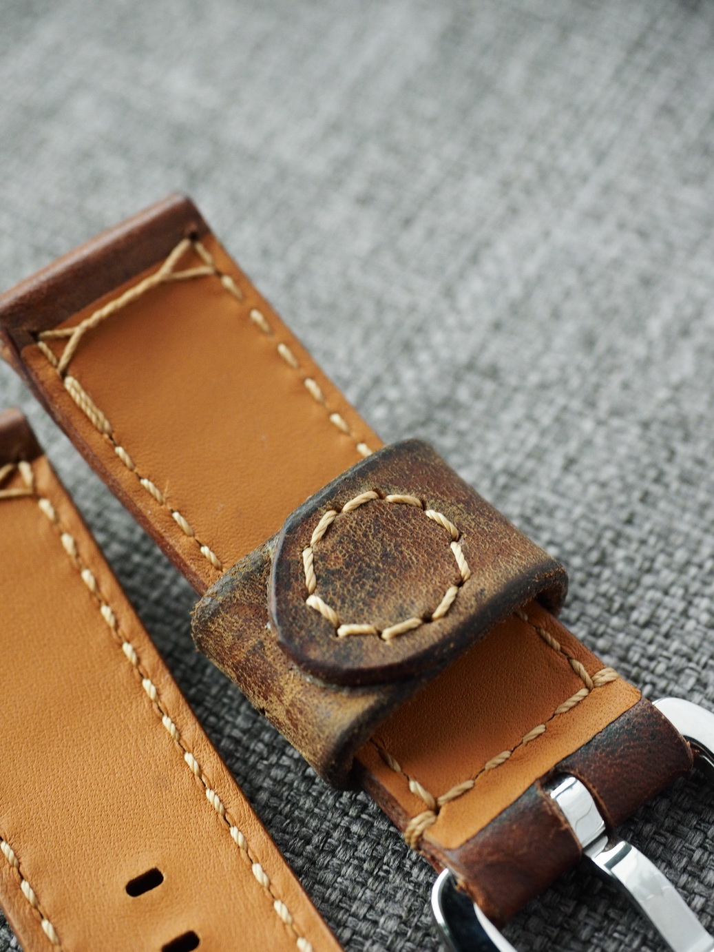特殊錶帶環,由古董軍袋上的拌扣製作而成。